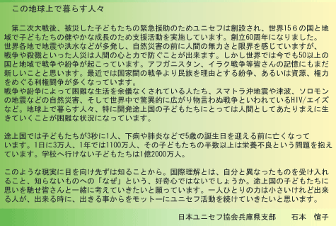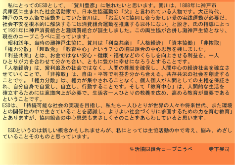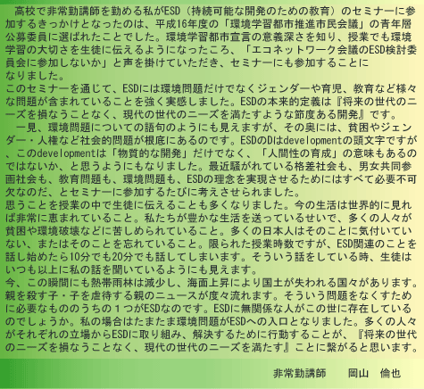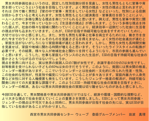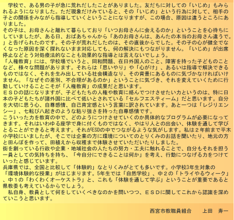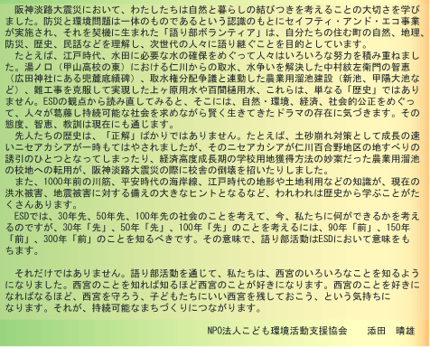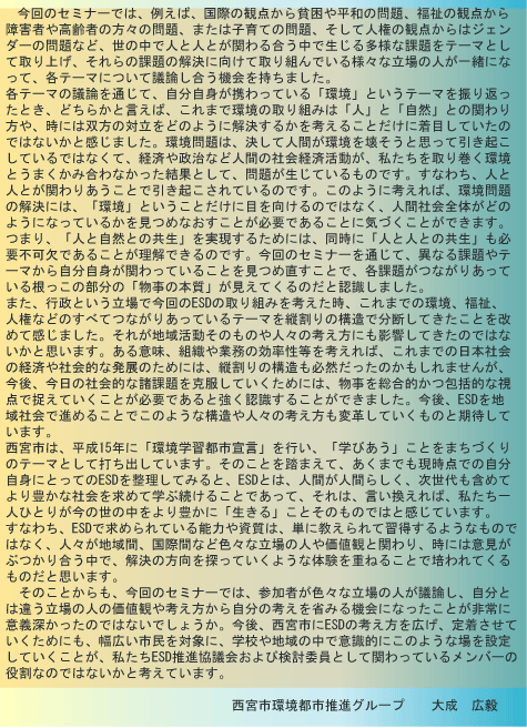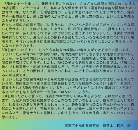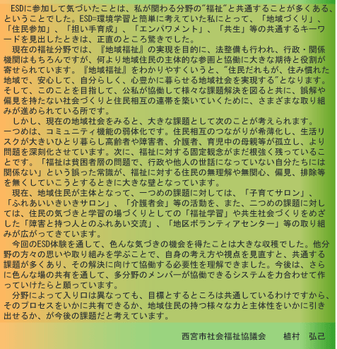 平成17年度に発足した西宮市ESD検討委員会メンバーがこれまで、自らの仕事 (社会的課題)とESDのつながりをまとめた個人メッセージを紹介します。